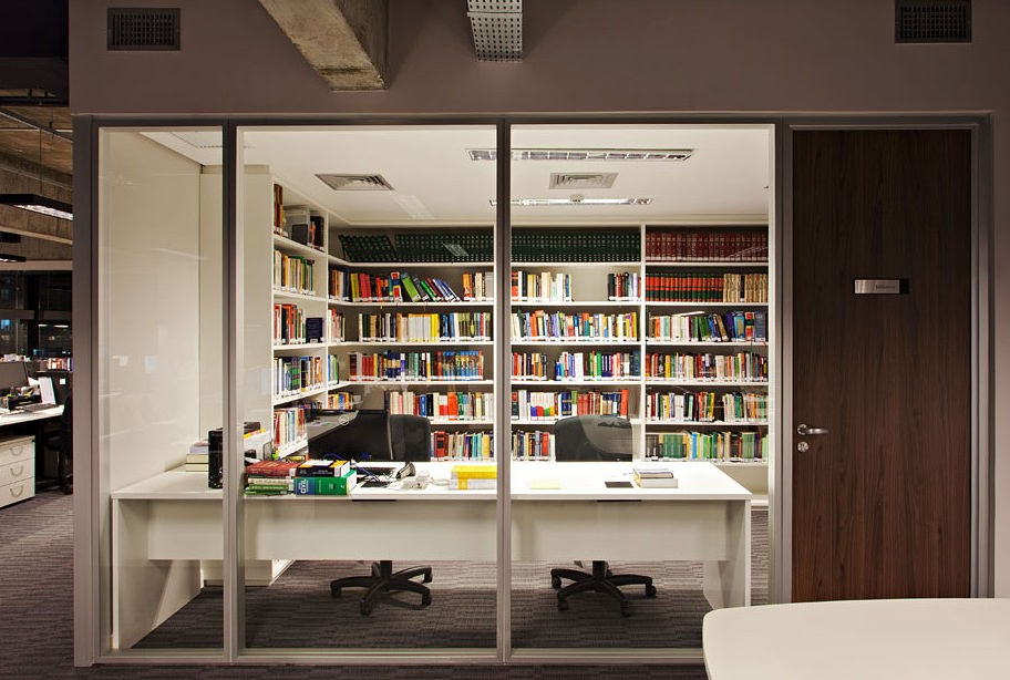 Mantivemos o conceito de open space total, com cada sócio integrado à sua equipe. Para unificar os dois pavimentos de forma prática, foi criada uma escada interna. O pavimento inferior foi projetado para centralizar as salas de reunião, auditório, recepção e lounge, visando o atendimento aos clientes e uma futura área de expansão. Já o pavimento superior concentrou a área de trabalho, com instalações que serviram como pontos de encontro e passagens, além da cafeteria, biblioteca, áreas de call e reuniões internas.